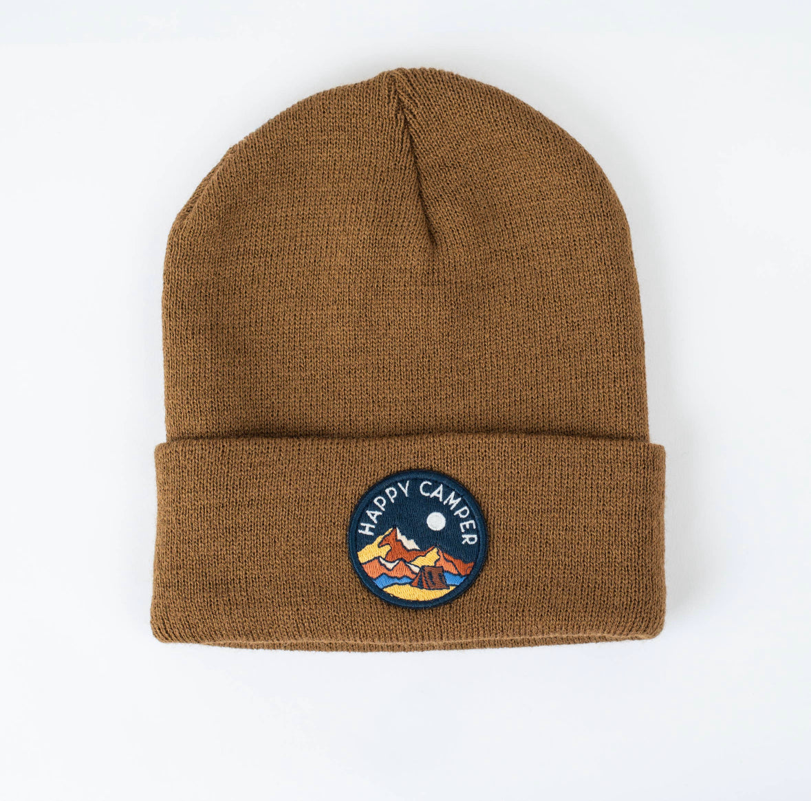 This colored beanie is cute, comfy and warm featuring an embroidered patch that says "Happy Camper".
