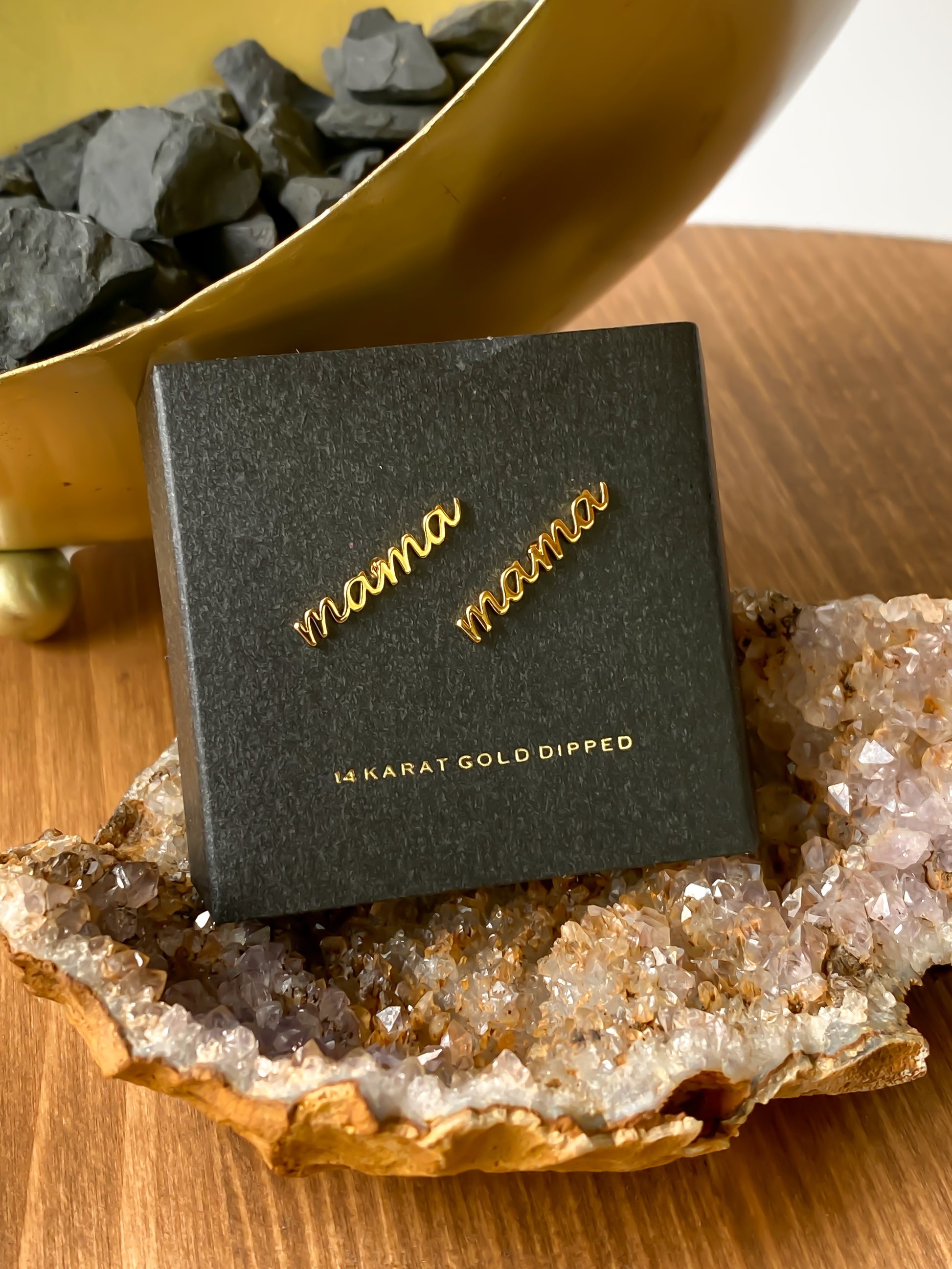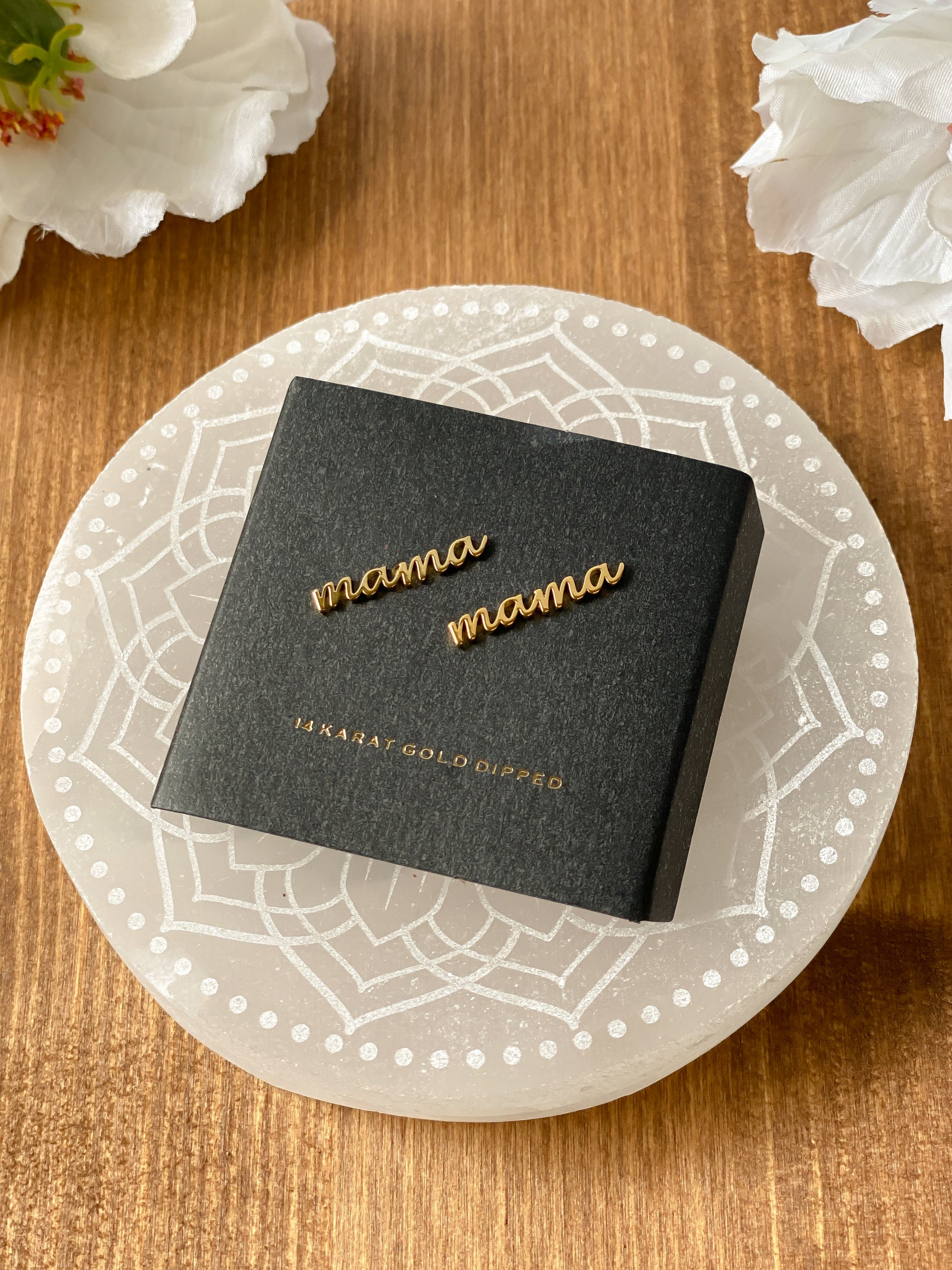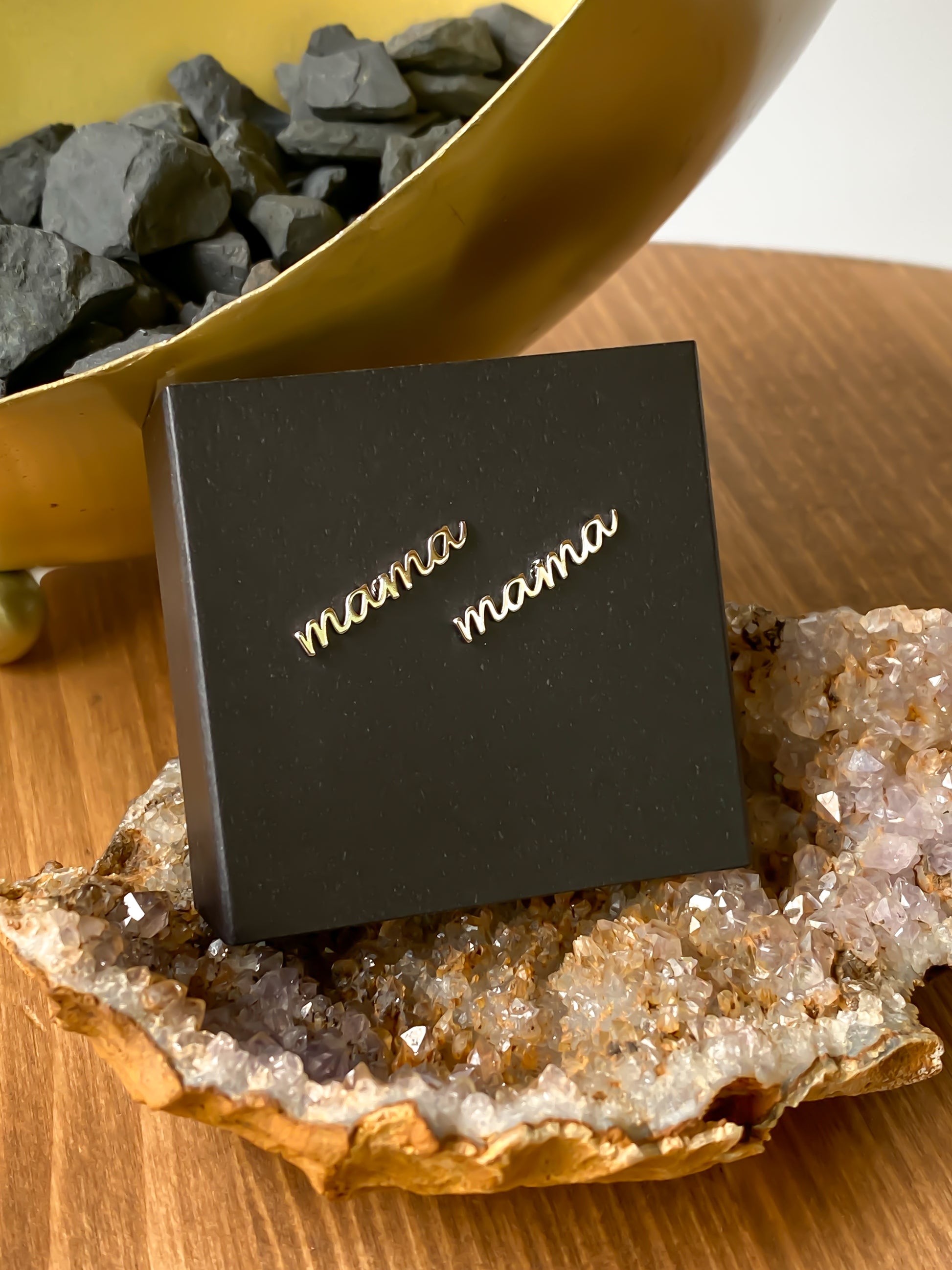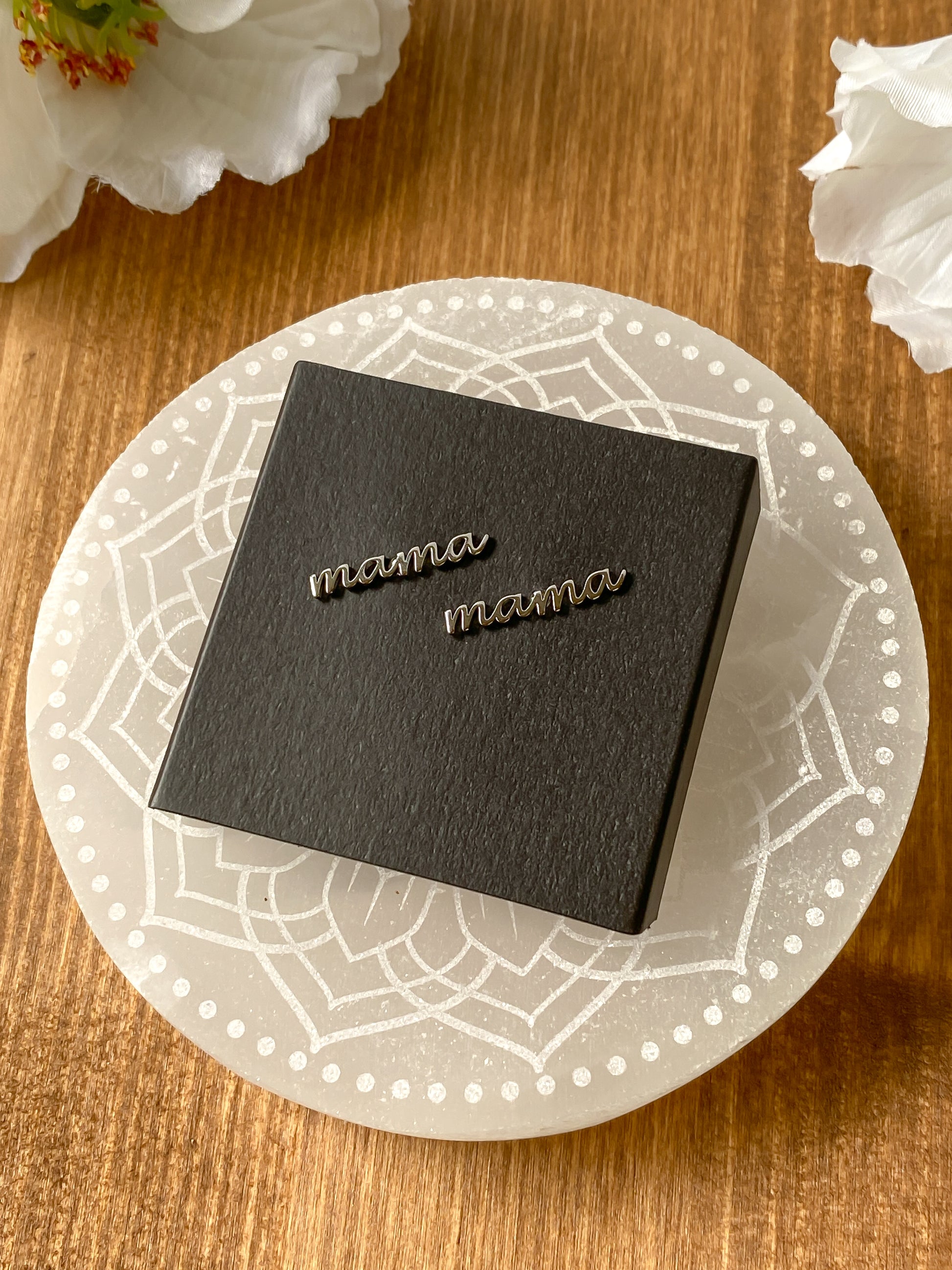 A darling pair of 'Mama' stud earrings that will pair with any outfit.