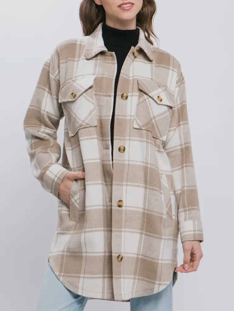 This Relaxed Plaid Shacket in Latte is perfect for casual wear. Crafted from a cream and latte plaid, the relaxed fit and dolphin hem provide a flattering silhouette, while the button up and long pockets add detail to the design.