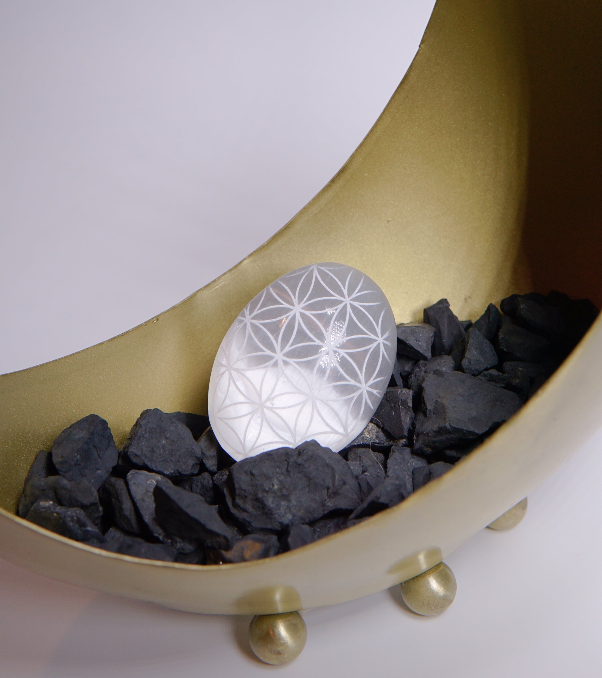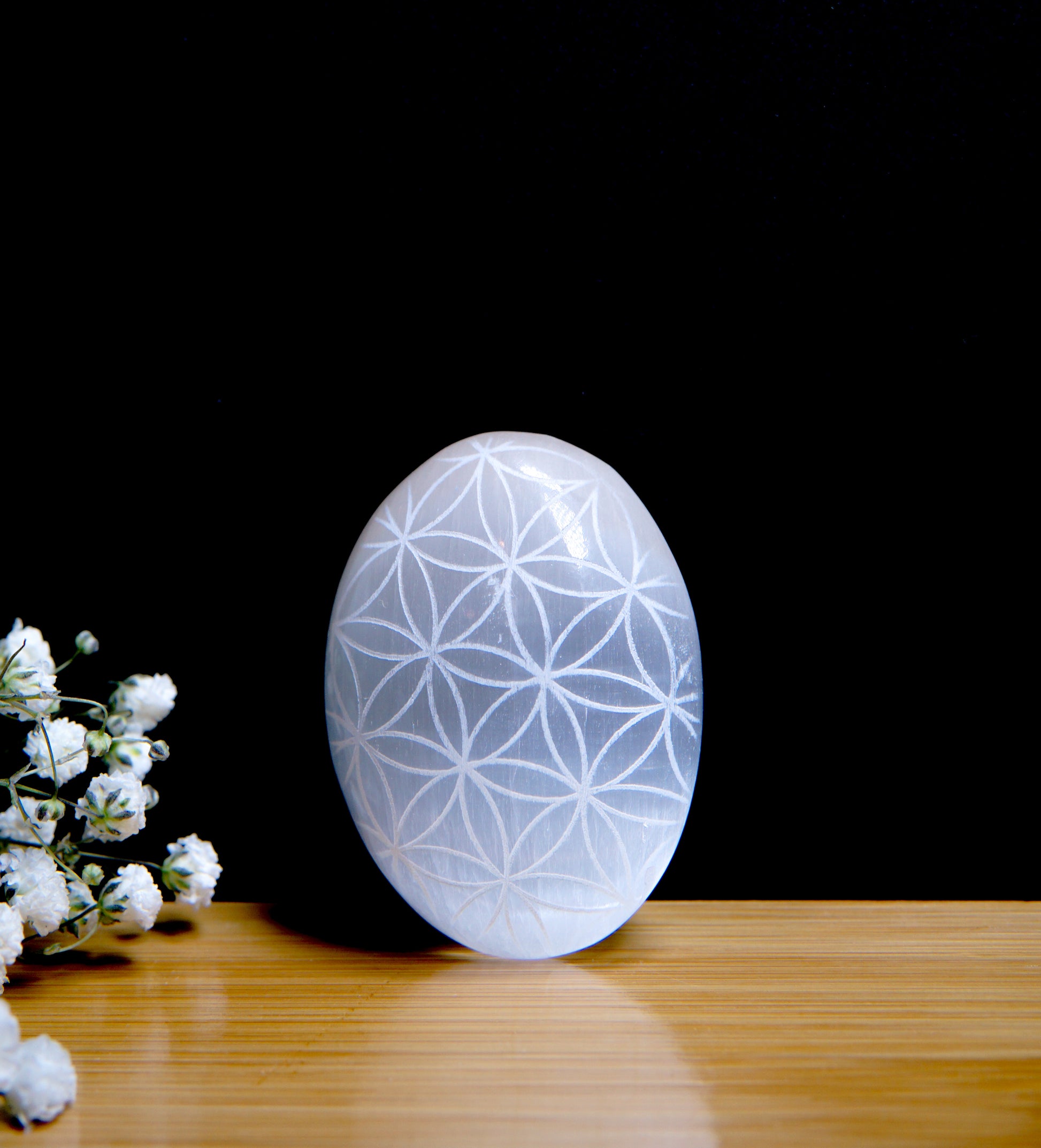 Selenite (Satin Spar) is one of the only stones that does not hold on to energy. It will neutralize energy which makes this palm stone perfect to carry with you daily. It will bring you peace as it clears any excess energy that you may be harboring.