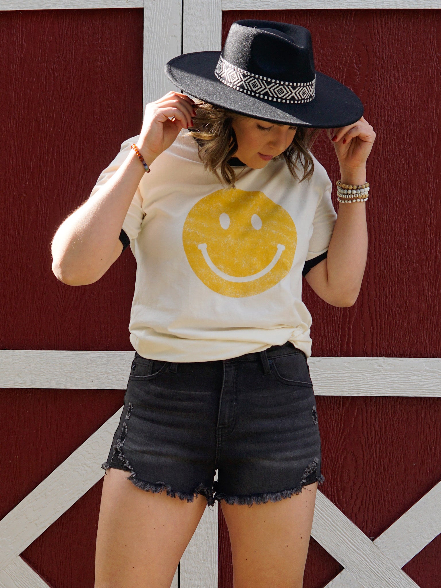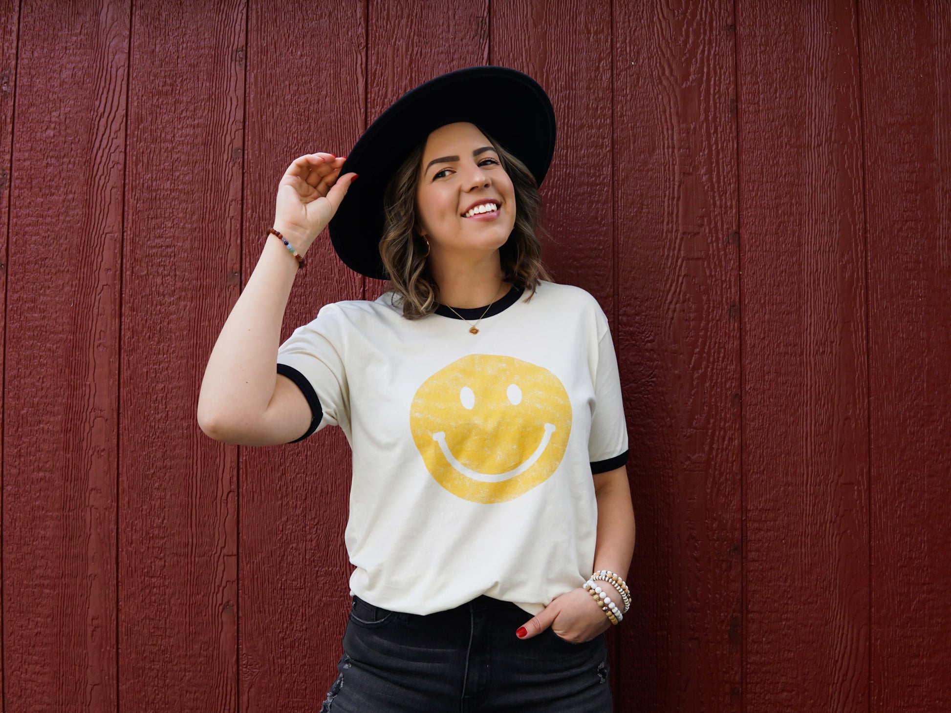 A ringer style tee with contrasting black binding on sleeves and collar.